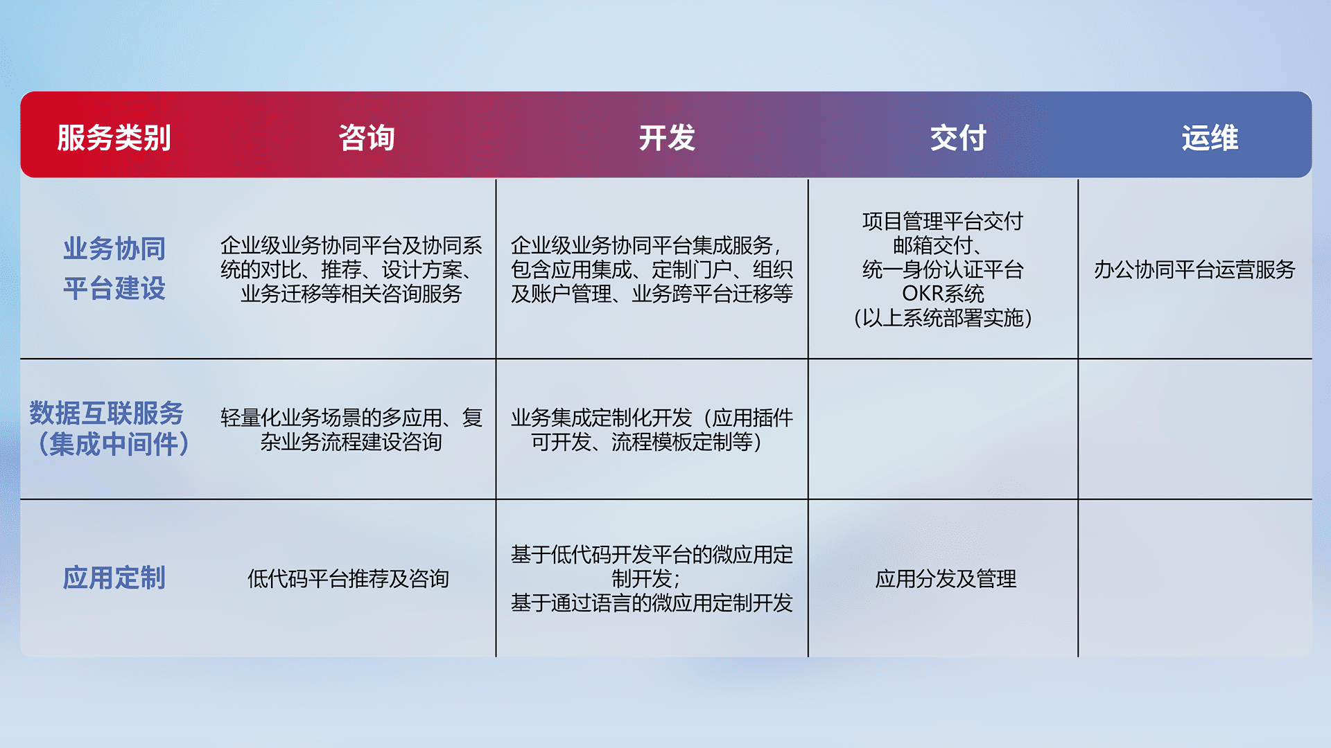针对钉钉、、企微、、、、IDaas等平台级产品提供产品的规划、、方案、、、交付、、、定制化开发等服务,,,,实现如统一协同办公、、、、智能客户服务、、、混合会议管理、、智能数据查询、、等业务场景,,实现数字化转型。。。